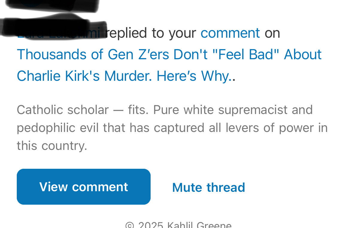 Thus, it became clear to me that in the post-Kirk era, semantic broadening hasn’t stopped or slowed. White supremacy can increasingly capture people of all races who hold a widening array of beliefs. In my case, I didn’t even have to say something nice about Charlie Kirk, I just said something negative about the people celebrating his death, and then she looked at my profile and saw I was Catholic. So, the criteria for this person (and the others who replied to me in support of her) for white supremacy-grouping are:
