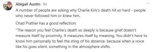 Another comparison is to the Trump assassination attempts. Well, these will obviously feel different because they weren’t successful, but also, as Brett Cooper pointed out, there’s something about the fact that Trump was in an actual political office. He’s in the seat of power of the Western world and is the most controversial man on the planet. We, unfortunately, have a ready-made category for that sort of thing: Lincoln, Roosevelt, Kennedy, Reagan.