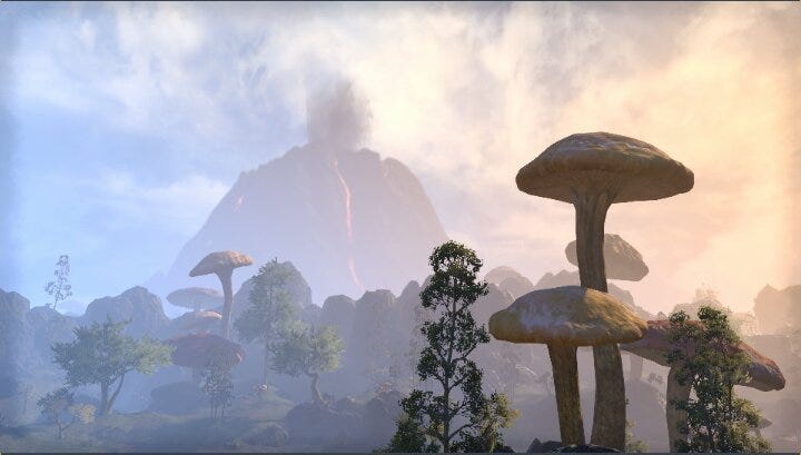 Red Mountain in Morrowind, for example, is not only the site of a great battle in Morrowind’s history, but also hearkens back to the prehistoric Dawn Era, where it emerged from the heart of a dismembered deity.