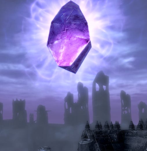 In TES V: Skyrim’s “Dawnguard,” the player must journey to the Soul Cairn. The Soul Cairn has already been mentioned as being the plane that is under the dominion of the Ideal Masters, former mortal necromancers whose plane is dedicated to storing captured souls. The Ideal Masters, take the form of giant purple crystals, and their power within this plane is, apparently, absolute—or at least as absolute as that of the Daedric Princes who rule other planes. The souls that make their way to the Soul Cairn are those which have been “soul-trapped,” a process by which a soul is bound to a crystal, called a “soul gem,’ via either enchantment or a spell. This process is the basis of the entire school of Enchantment, whereby all weapons and armor can be enchanted using these soul gems. Once bound to a soul gem, the soul is transported to the Soul Cairn eternally.